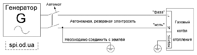 При автономному підключенні генератора потрібно заздалегідь визначити «нуль» котла опалення та з'єднати його з землею.